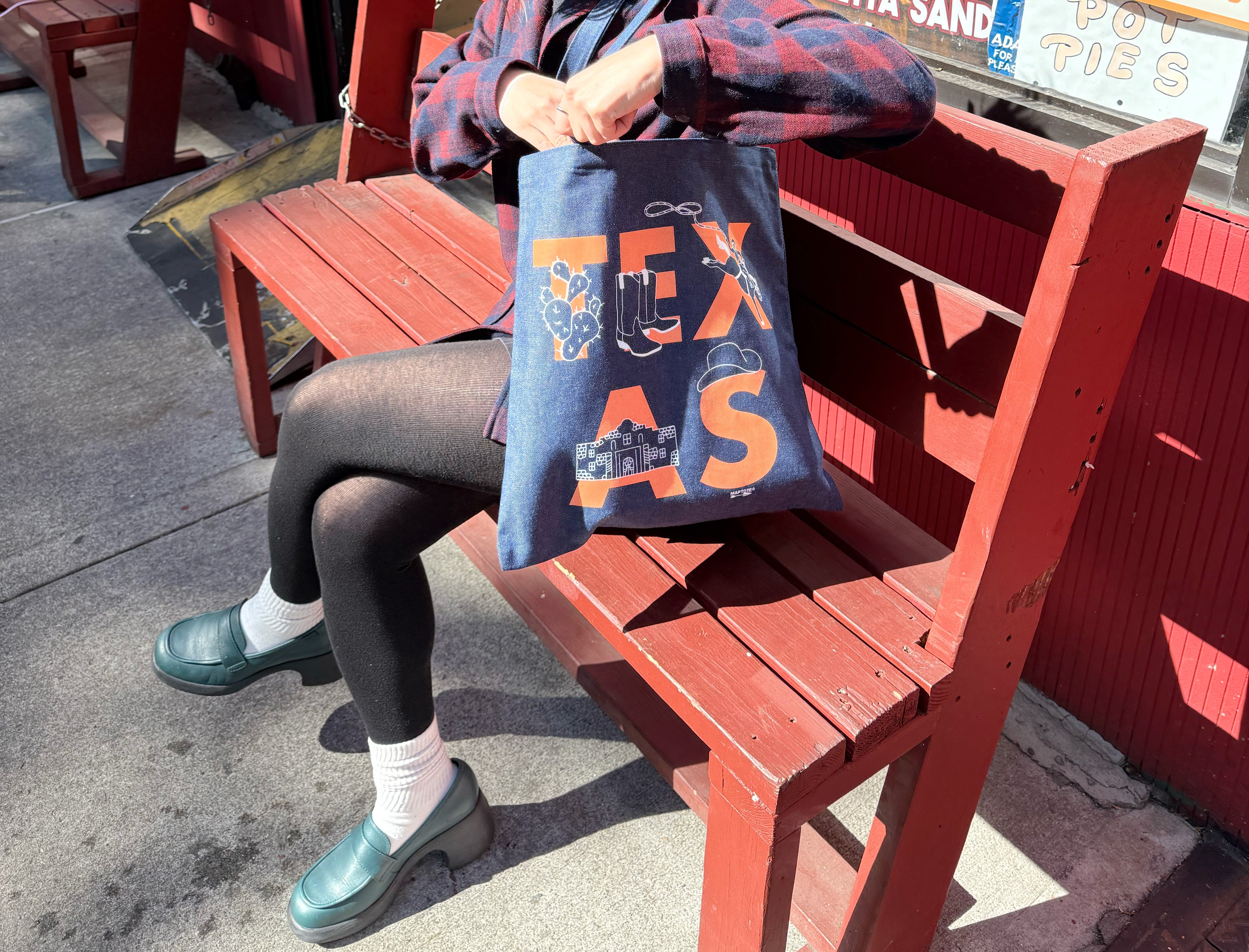 Crafted from durable denim and emblazoned with a bold Texas font, it's as tough and stylish as a pair of cowboy boots. Cut, sewn, and printed right here in Brooklyn, it's a little bit of New York charm with a whole lot of Texas pride.